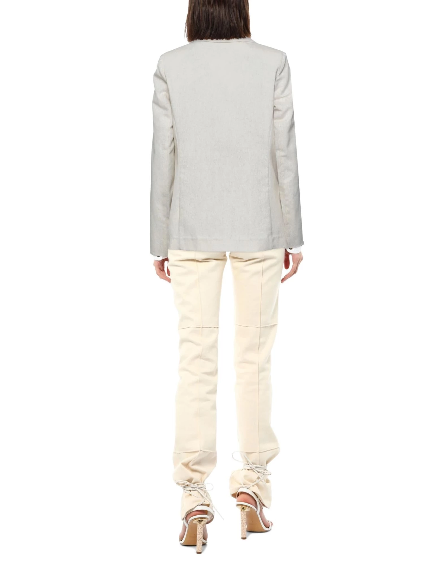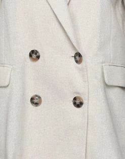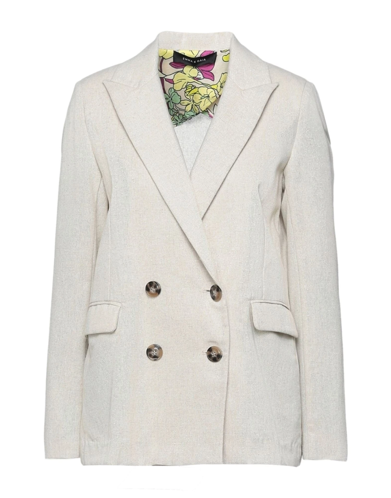 plain weave, lamé, no appliqués, solid color, lapel collar, double-breasted, long sleeves, partially lined interior, button closing, multipockets
