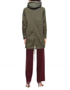 plain weave, no appliqués, solid color, neckline with removable hood, single-breasted , long sleeves, snap buttons fastening, zipper closure, multipockets, unlined, drawstring waist