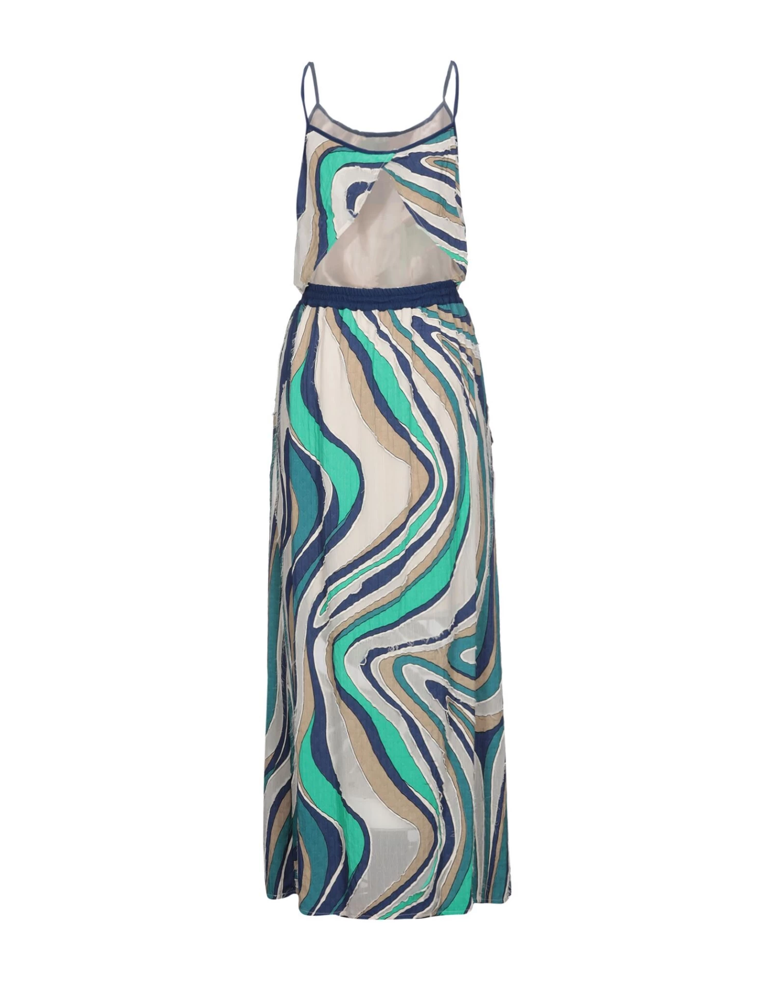 crepe, no appliqués, multicolor pattern, deep neckline, sleeveless, multipockets, unlined