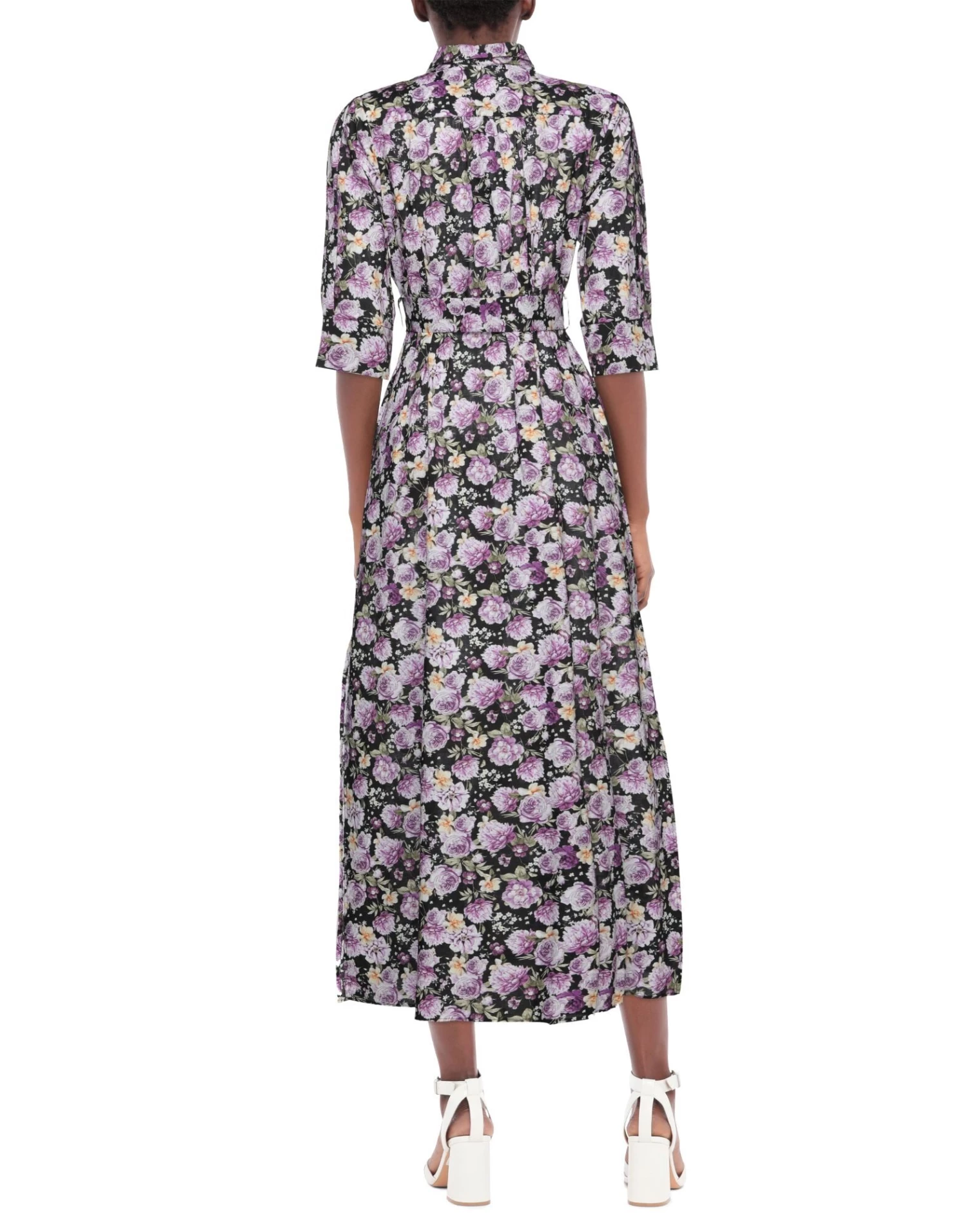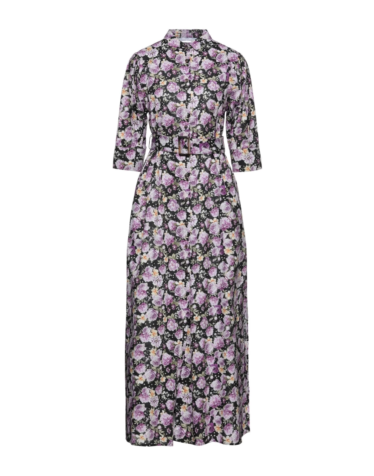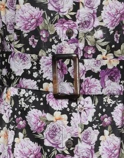 plain weave, belt, floral design, classic neckline, 3/4 length sleeves, unlined, button closing, multipockets, side slit hemline