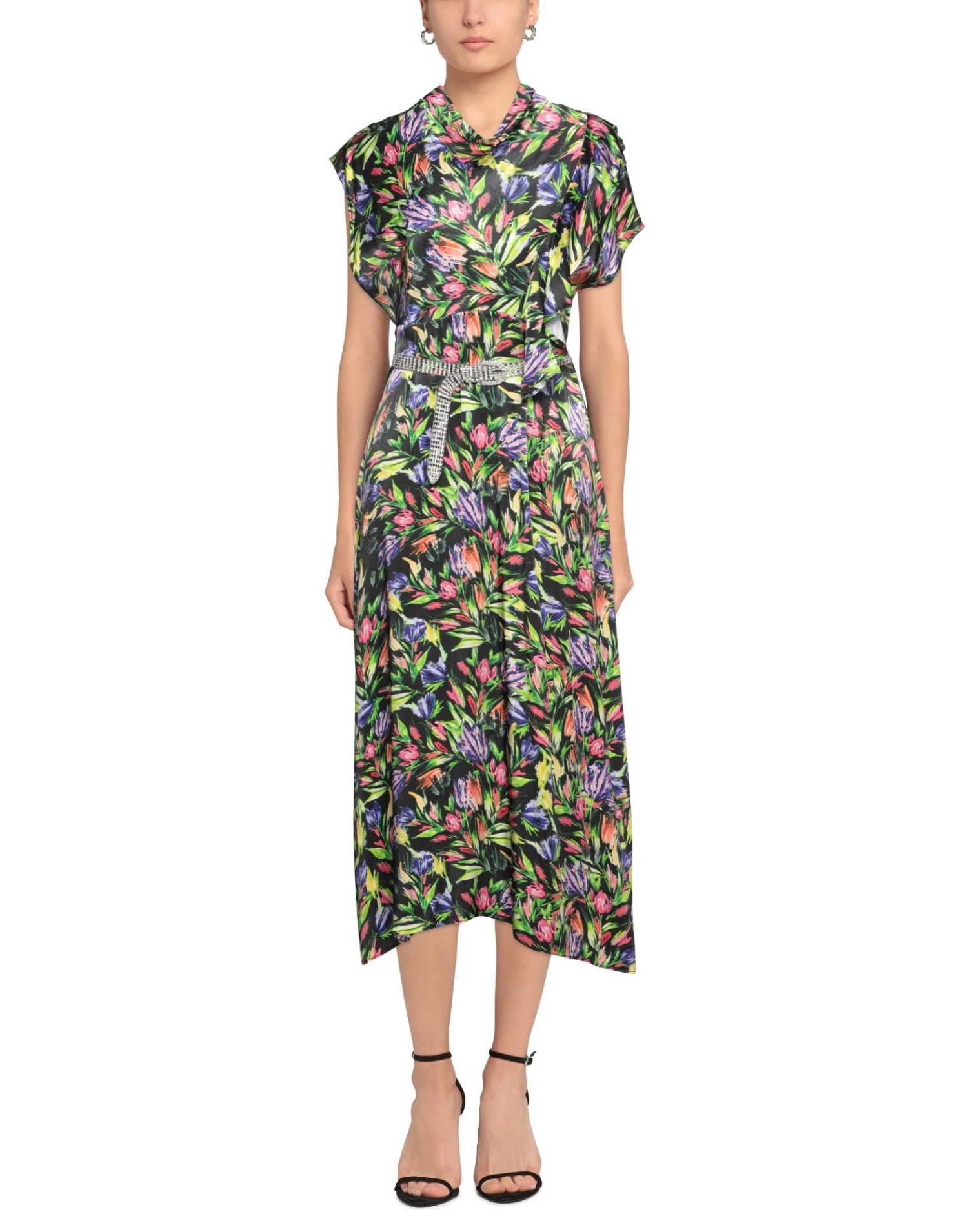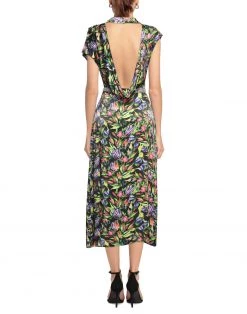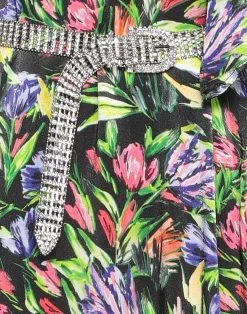 satin, belt, floral design, turtleneck, short sleeves, unlined, no pockets, zipper closure