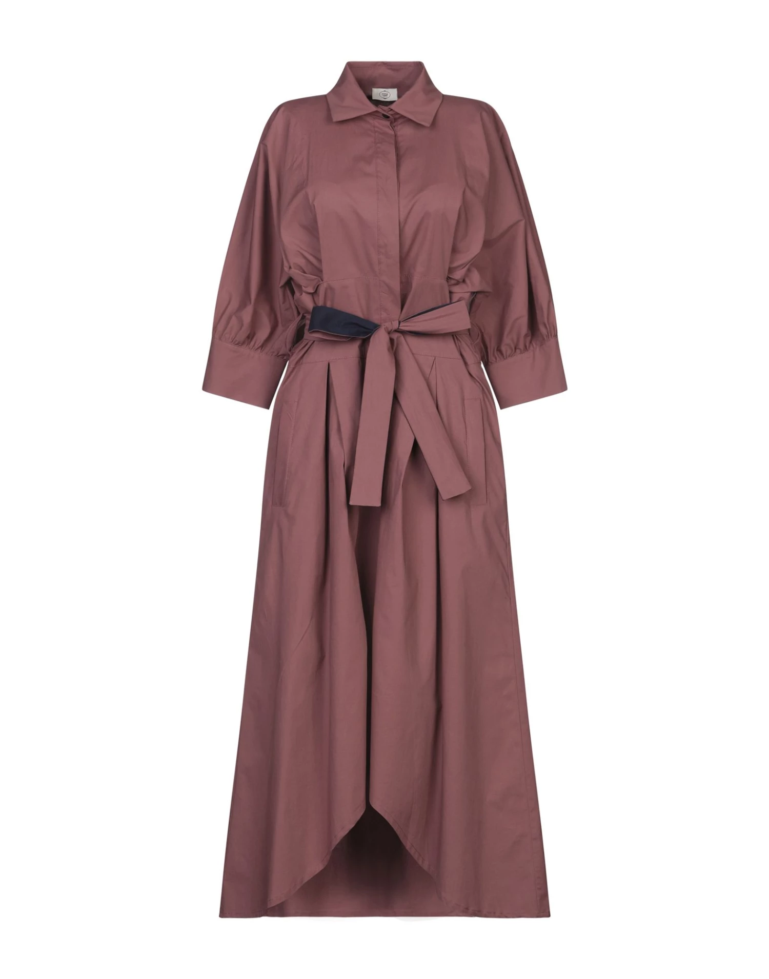 plain weave, belt, solid color, classic neckline, 3/4 length sleeves, multipockets, front closure, button closing, unlined, stretch