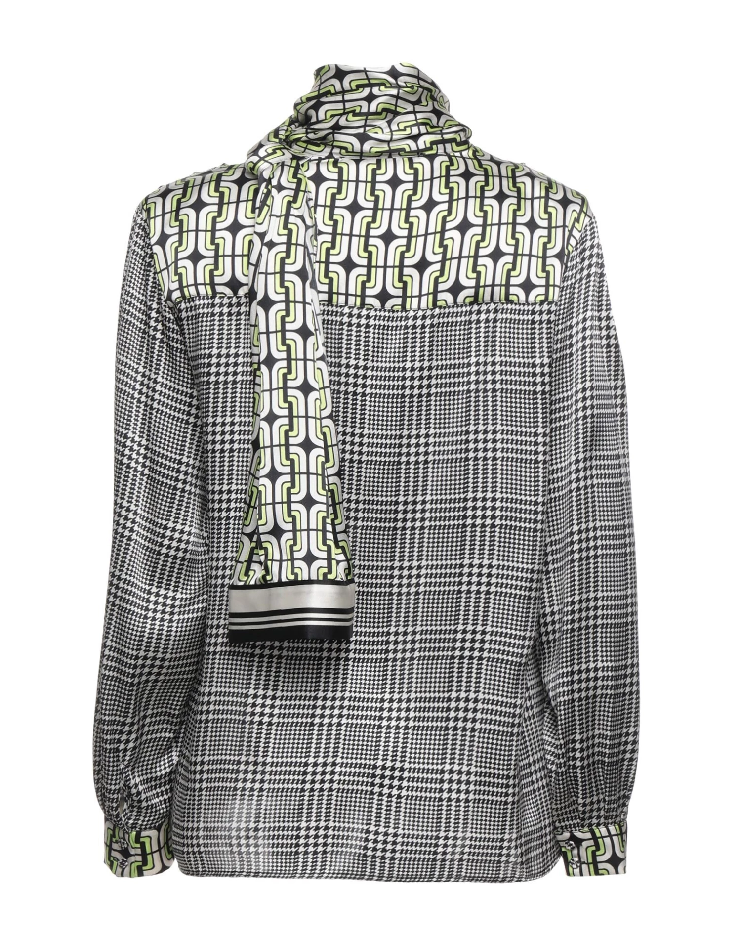 satin, no appliqués, glen plaid, collar with draped neckline, long sleeves, front closure, button closing