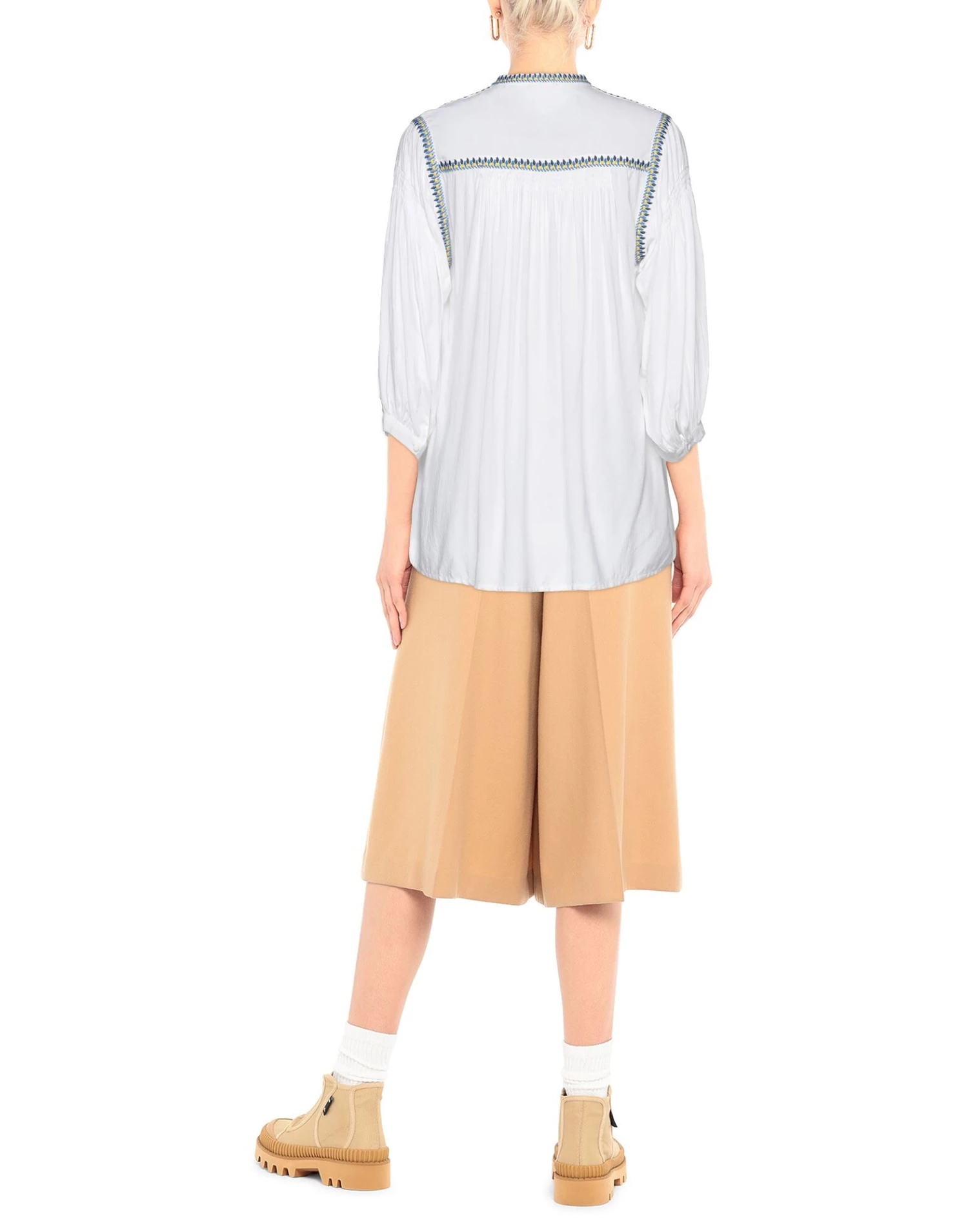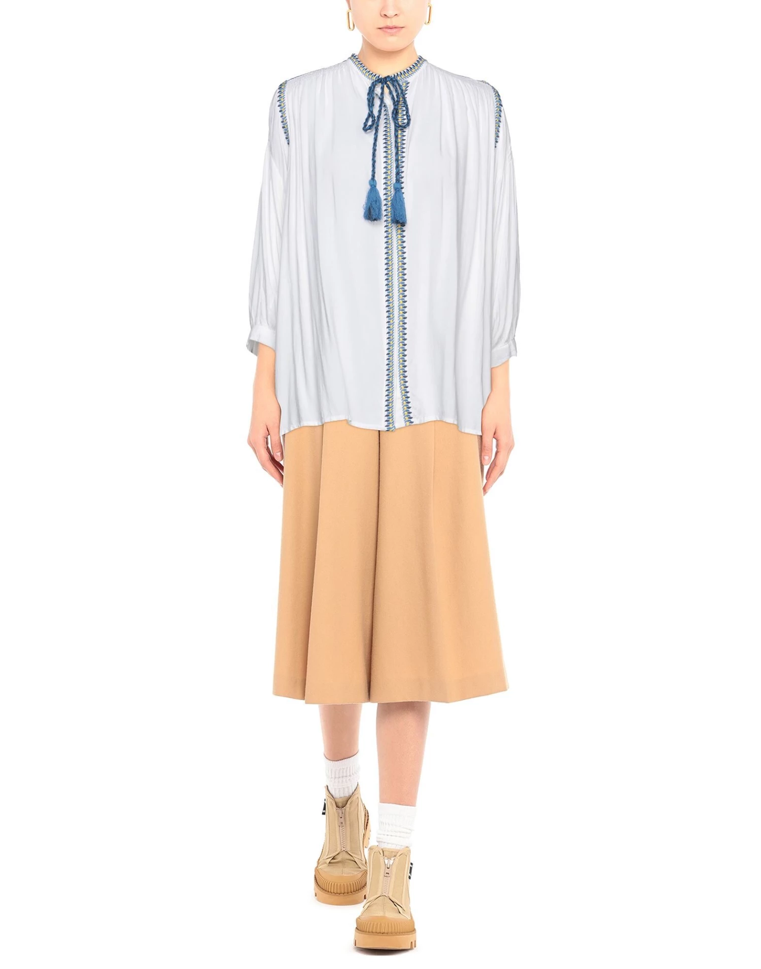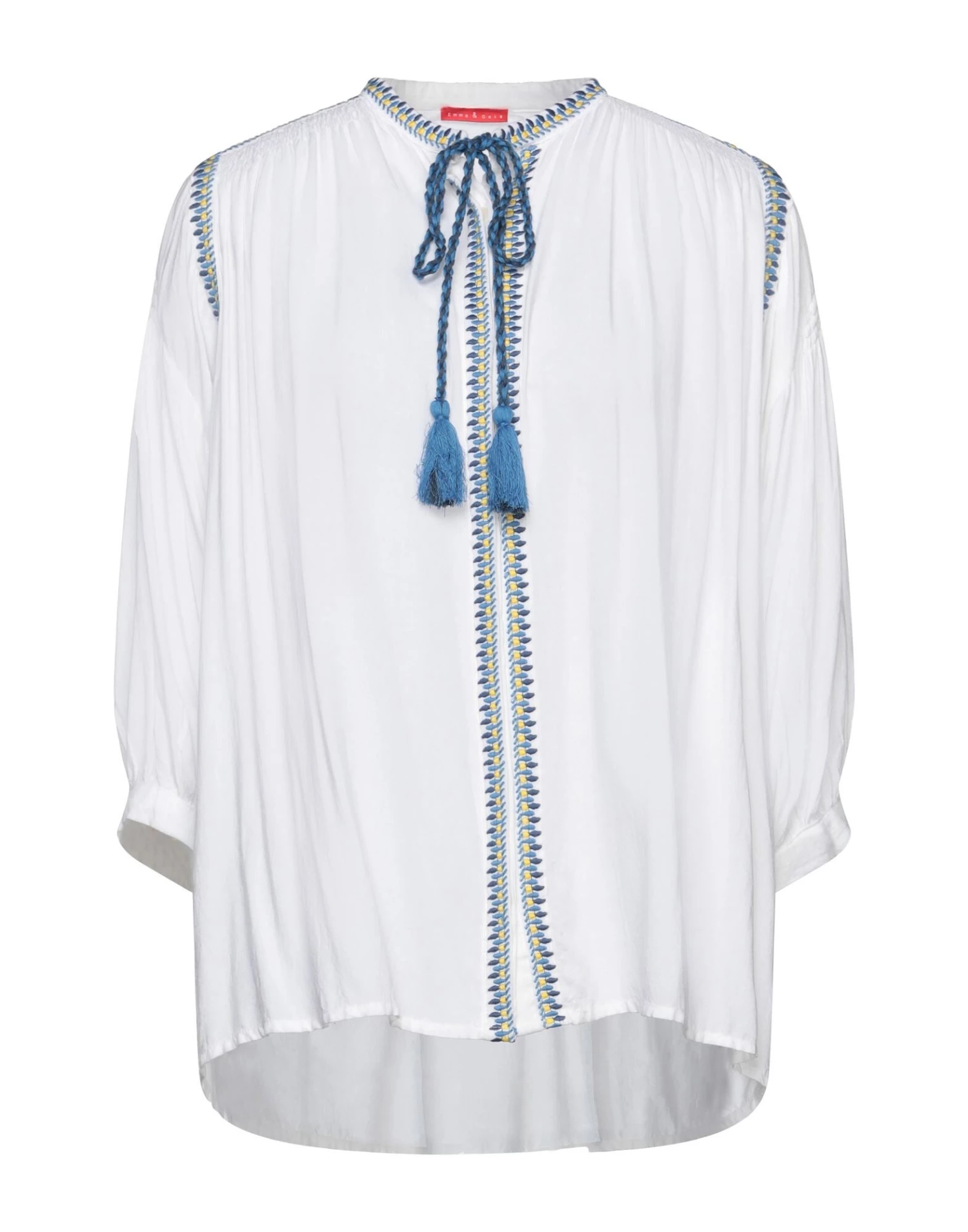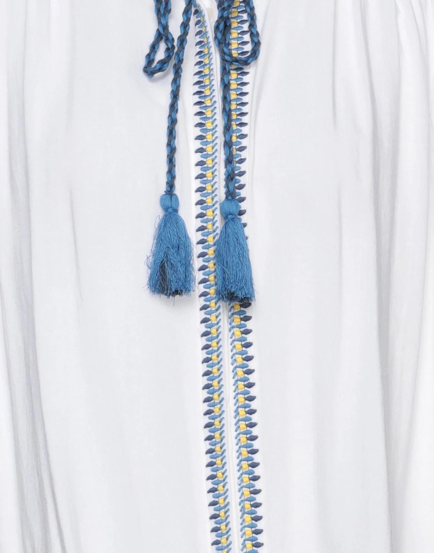 plain weave, tassels, embroidered detailing, multicolor pattern, round collar, 3/4 length sleeves, button closing, no pockets