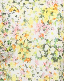 plain weave, ruffles, floral design, round collar, short sleeves, fully lined, no pockets