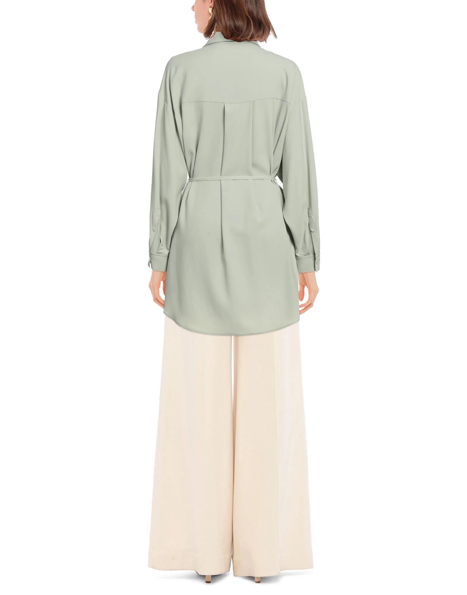 crepe, belt, solid color, classic neckline, long sleeves, buttoned cuffs, button closing, no pockets