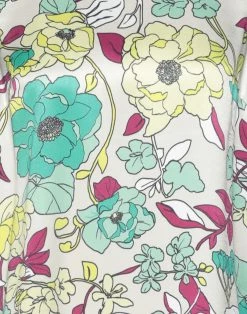 satin, no appliqués, floral design, round collar, sleeveless, zipper closure, no pockets